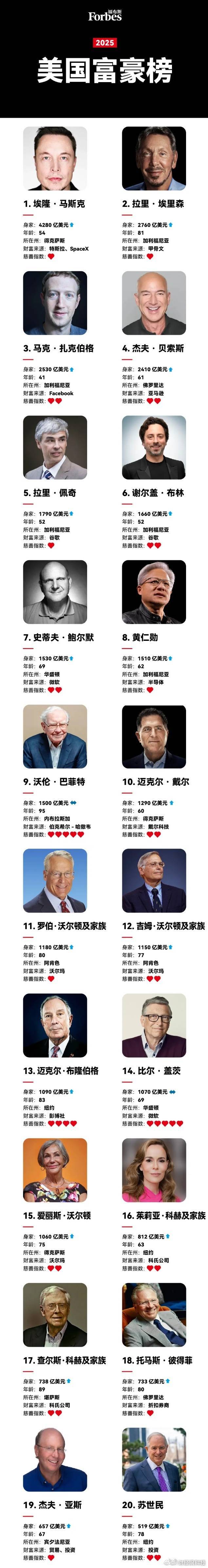 榜首位置也诞生了新纪录:埃隆·马斯克(Elon Musk)成为《福布斯》美国富豪榜首位身家突破4000亿美元的成员。他连续四年蝉联美国首富,身家高达4280亿美元,较去年增加1840亿美元——这得益于特斯拉股价上涨56%,以及他的未上市火箭公司SpaceX和人工智能公司xAI估值持续攀升。